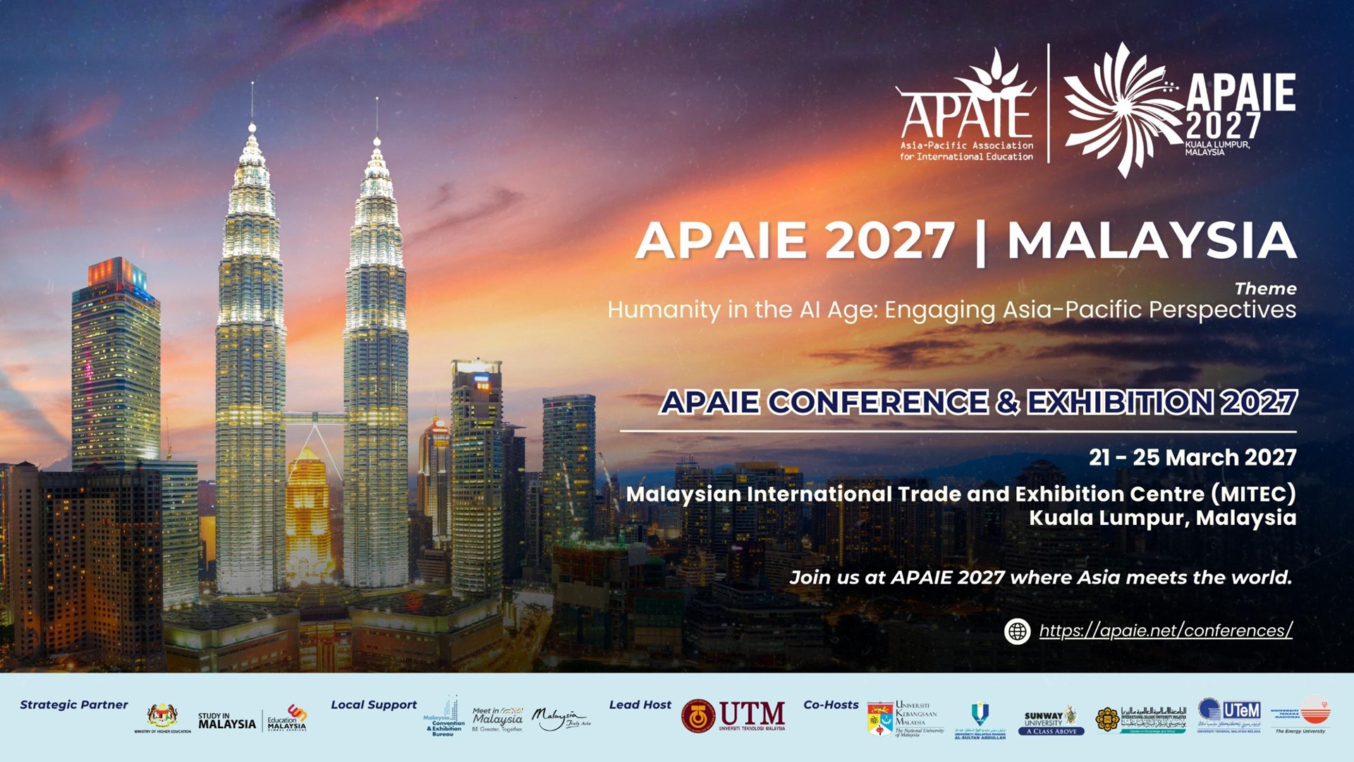 On behalf of APAIE, it is my great pleasure to warmly invite you to join us for the APAIE 2027 Conference and Exhibition in Kuala Lumpur, Malaysia, taking place over 21–25 March 2027.